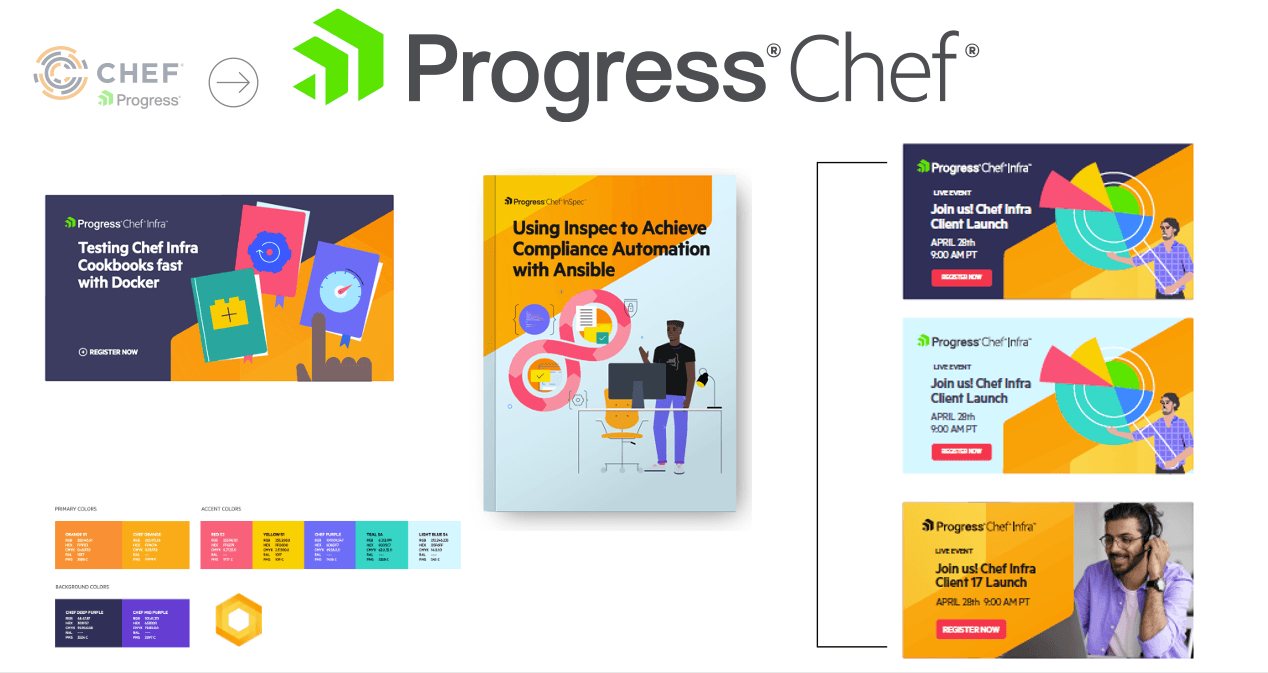 When Chef joined Progress, we began to align the Progress and Chef brands most notably with our combined logo, while keeping the Chef look and feel intact. This phase allowed Progress to be intentional and aware before making any changes. The Chef brand touches users, employees, customers, and the rest of the DevOps industry. All these people have been invested in the Chef brand, and any change to the brand could be potentially disruptive to all of them.