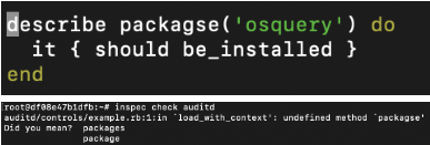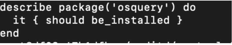 Example of failed test case – You’ll be testing for the package Osquery installed on your target node, which is not the case. So, the resulting result is failed.