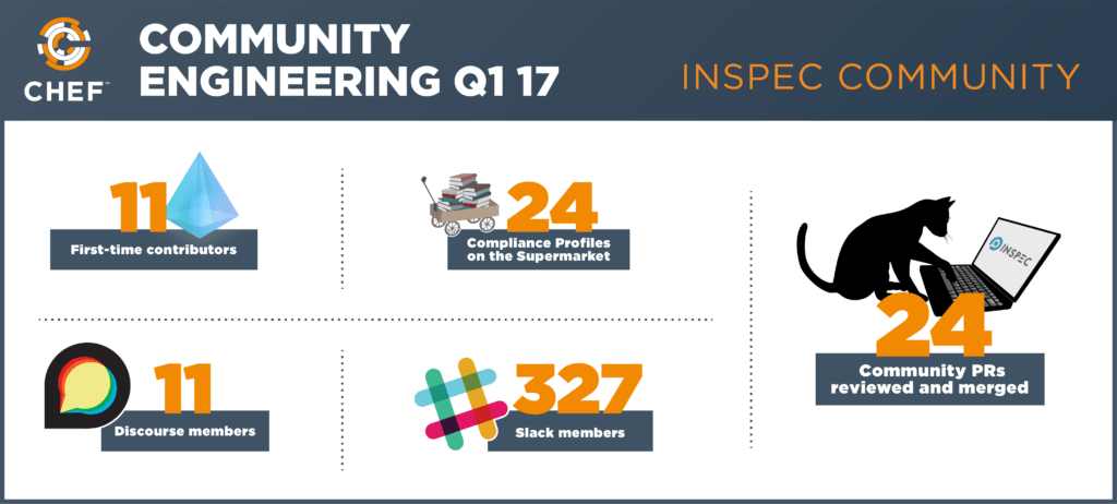 The community around compliance automation is really starting to take off, too. In the first three months of the year there were eleven first-time contributors to InSpec and more compliance profiles were published to the Supermarket.