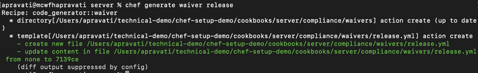 Within your cookbook, execute the command $ chef generate waiver <name of the file>. The output tells you that a new directory is created for waiver, under compliance folder.