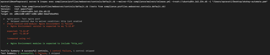 nginx-port is skipped,and the other two controls are executed. $ sudo chef-client command will execute the cookbook in the target node along with all the recipes, compliance and waivers files.
