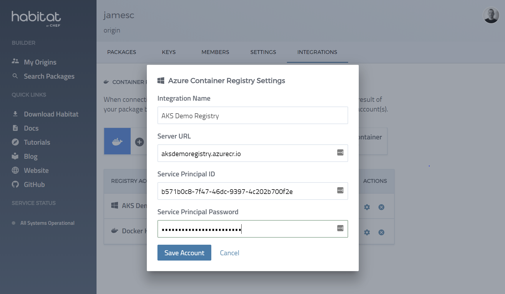 The integration is simple to set up – you just have to create a service principal in Azure and then setup Habitat Builder to use the service principal.