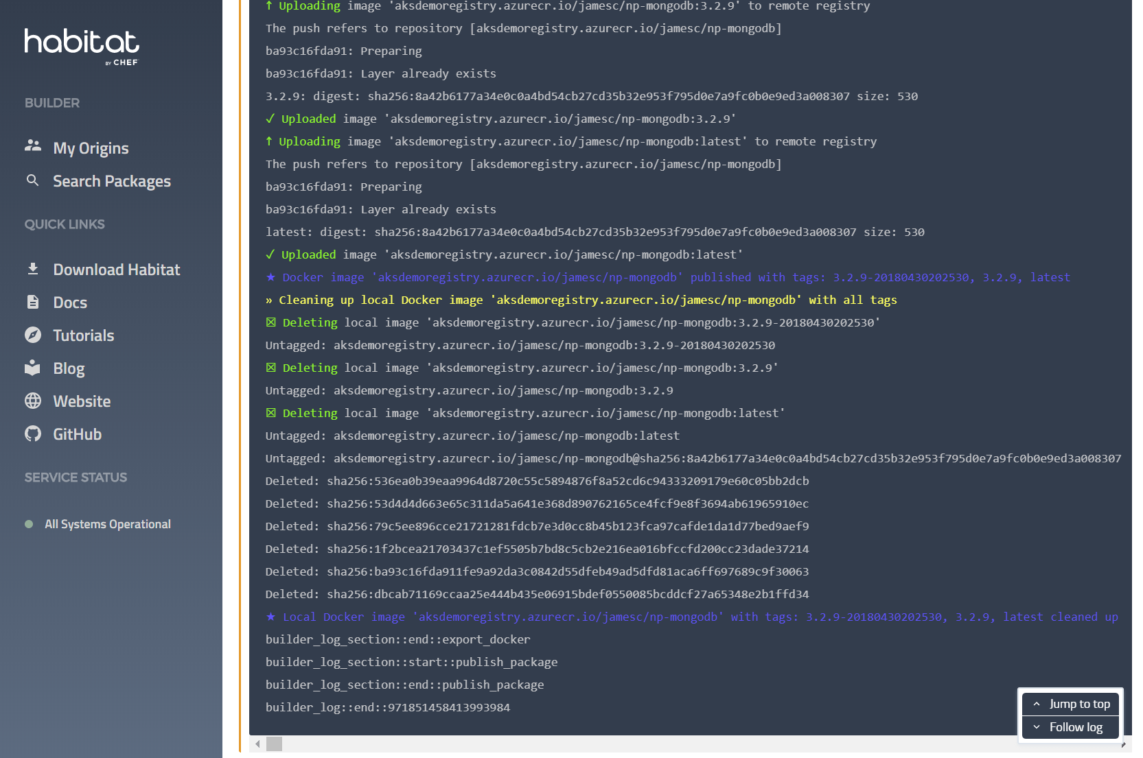 Once that is done, you connect your plan to the registry and Habitat Builder will automatically push all newly build packages to ACR.