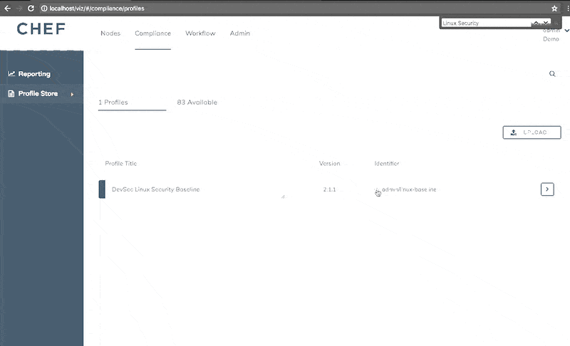 Profiles can be downloaded from the Compliance View in Chef Automate by navigating to the “Profile Store” option on the left-hand menu, selecting the desired profile(s) from the “Available” tab, and clicking the “get” button.