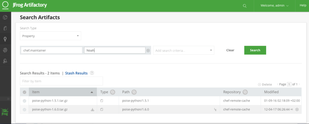 The browser shows, that the home-made Cookbook was successfully uploaded to Artifactory. The screenshot also underlines, that also the downloaded Cookbook was processed and cached by Artifactory. In Illustration 4, you see a search performed on all artifacts, including Chef Cookbooks, that is another example of a cross-cutting Artifactory functionality. In our example, we perform a Property search, and look for artifacts having a defined maintainer.