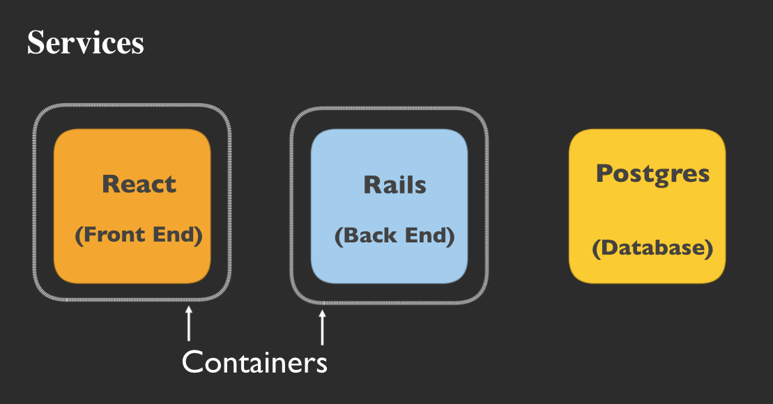 Let’s run the React and Rails services in containers – then don’t have to be stateful, so we can take advantage of the speed and flexibility of running them in containers.