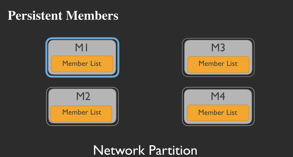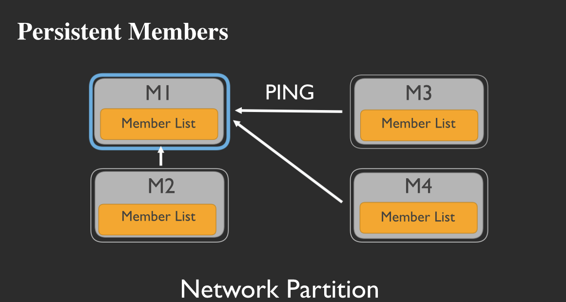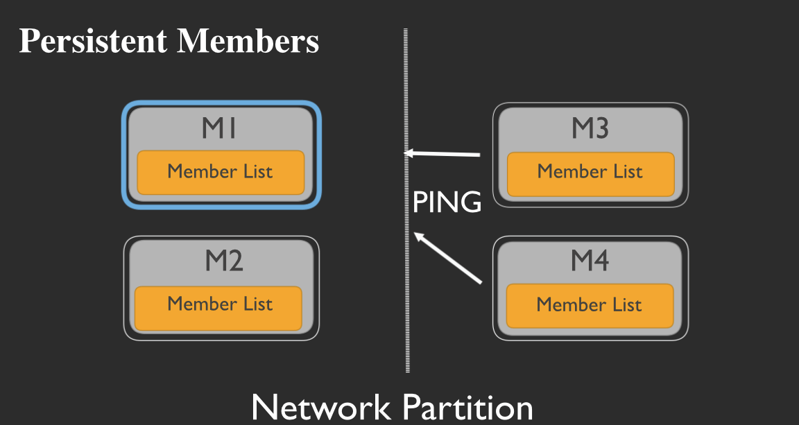 However, rather than marking the member dead and stop looking for it, M3 and M4 will continue to look for M1. Then, if the network partition heals:
