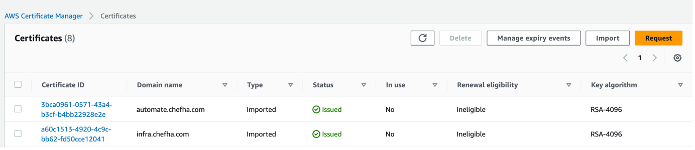o Set automate_lb_certificate_arn with the arn value of the Certificate created in AWS ACM for the DNS entry of chefautomate.example.com