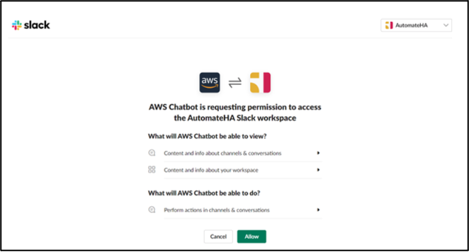The integration with Slack requires an additional service to get the communication established with AWS CloudWatch. Although using AWS Lambda functions is an option, the easier solution is to leverage the AWS ChatBot service. This service was launched in 2019 and does not require any code to integrate with Slack. By simply selecting Slack in the AWS Chatbot dropdown menu, you are redirected to Slack where you will authenticate and select the Slack Workspace you would like to send alerts to.