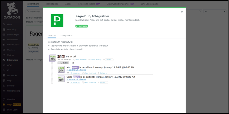 These integrations can be configured from within the Datadog User Interface. Simply select Integrations from the left-hand navigation and search for the desired communication solution.