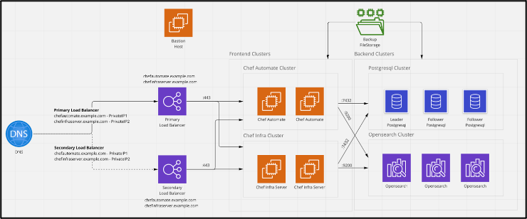Chef Automate HA in the AWS cloud leverages managed services including OpenSearch and PostgreSQL components. This strategy benefits customers who have adopted AWS Services to take full advantage of the simplicity and scalability of the public cloud. This deployment involves using a set of standard scripts to automate the process of configuring the deployment process and required prerequisites, including creating EC2 instances, load balancers, security groups and subnets.