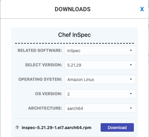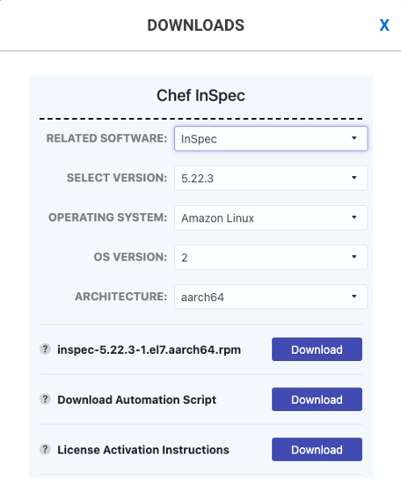 This interface also gives you other download options. You can download the shell script to download Chef InSpec, which can be embedded into your existing code or run as a standalone program.