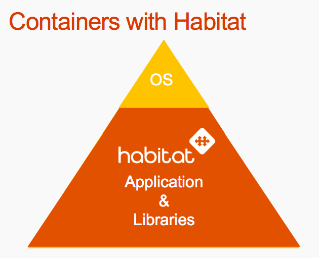 Habitat, by contrast, turns the traditional container workflow on it’s head. You start with the application. Once you have the application, you add in the libraries to run that application, and then only at the end do you add in a bare minimum operating system that is just enough to run your application and nothing more.